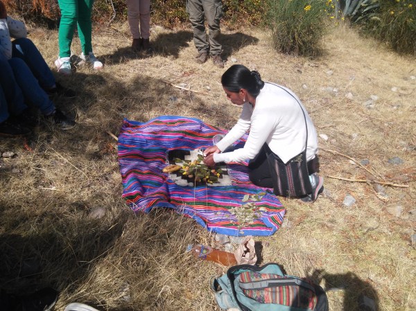 > La profesora y yachaq Miriam Vitorio de Carhuaz preparando la ofrenda antes de la cosecha de las plantas. Foto por Roxana Sepúlveda.