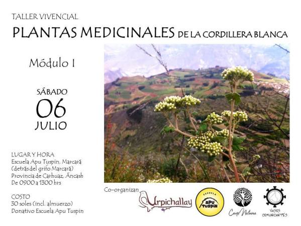 Tuvimos el agrado de organizar en alianza con la escuela Apu Tuspin, la Asociación Urpichallay y Coop Naturae el primer módulo de una serie de talleres sobre las plantas medicinales de la Cordillera Blanca. Si bien el tema particular del evento fue el de las plantas medicinales, un tema más grande que buscamos con el evento fue el de conectarnos con la sabiduría de la naturaleza, de la ancestralidad e identidad, y con nosotros mismos.