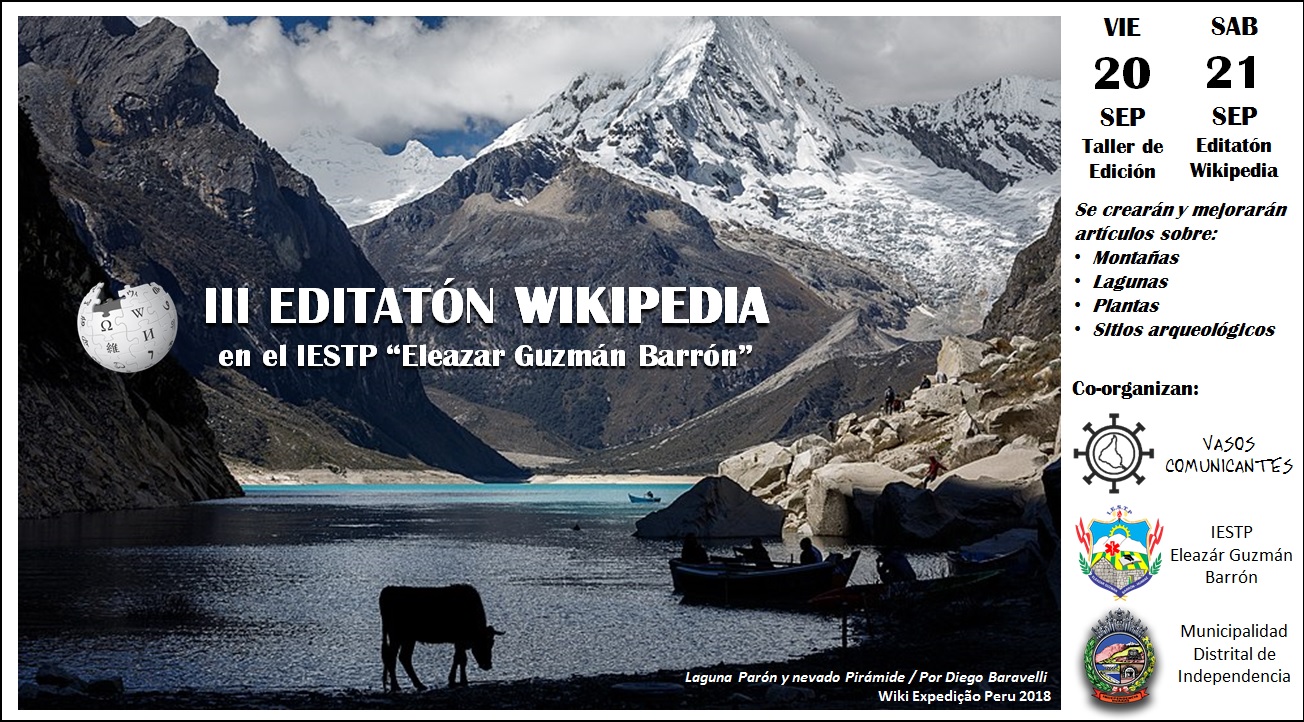 La Tercera Editatón en 2019 en Huaraz fue organizada a través de una alianza entre la asociación Vasos Comunicantes, a la Municipalidad Distrital de Independencia y el Instituto de Educación Superior Tecnológico Público «Eleazar Guzmán Barrón». Estuvo enfocada a mejorar y crear artículos con el apoyo de los profesores y estudiantes del Programa de Estudios de GUÍA OFICIAL DE TURISMO. Pudimos crear los siguientes artículos relacionados a la Cordillera Blanca en la enciclopedia virtual más grande del mundo: