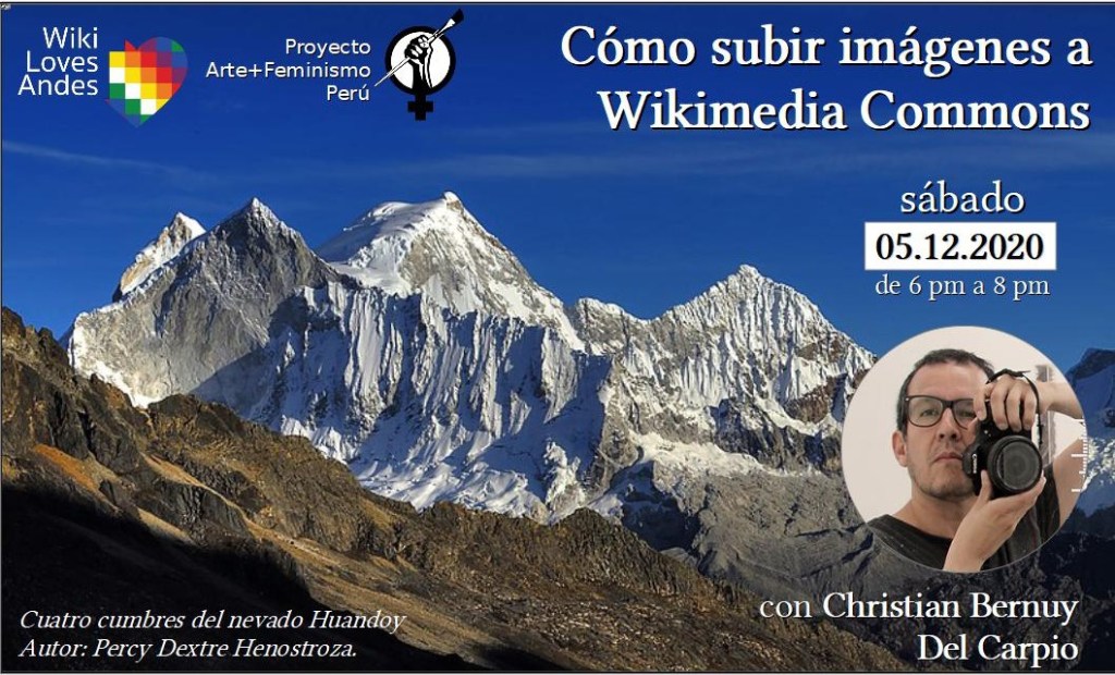 SÁBADO 05 DE DICIEMBRE: Cómo subir imágenes a Wikimedia Commons, con Christian Bernuy. De 6 a 8 pm. En este webinar aprenderemos sobre las licencias y procedimientos para subir una imagen a Wikimedia Commons. Este evento se enmarca dentro de las actividades de Wiki Loves Andes 2020. Se solicita a los participantes tener una foto lista de su autoría para subirla como ejercicio relacionada a un tema enciclopédico (patrimonio natural, cultural, manifestaciones artísticas, eventos sociales, etc.)