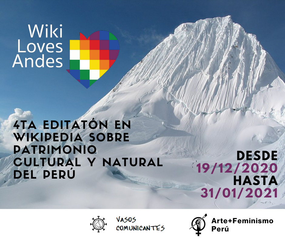 Vasos Comunicantes, con el apoyo del proyecto Arte+Feminismo.Perú y la Fundación Wikimedia, se complace en invitarlos a participar en el concurso nacional de edición sobre nuestro patrimonio natural y cultural dentro del marco del programa Wiki Loves Andes 2020.