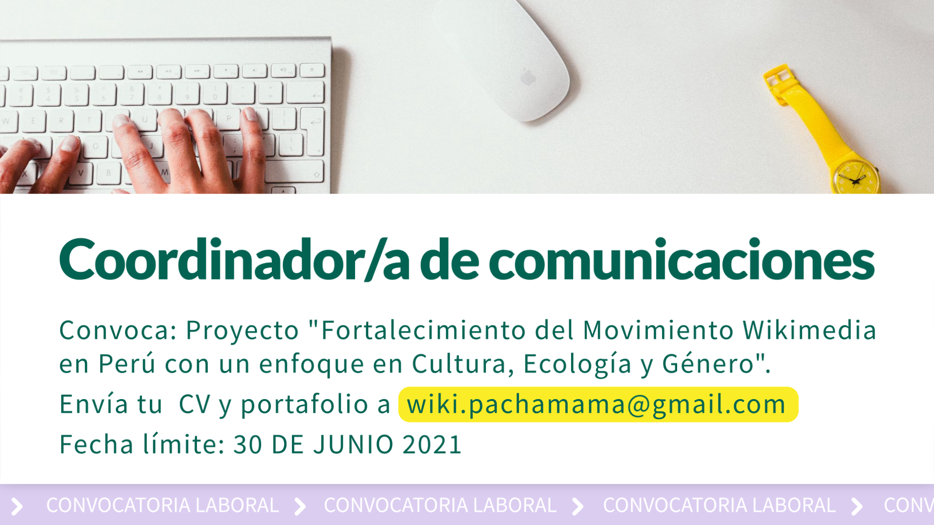En ese sentido, hemos abierto una convocatoria para encontrar a una persona para ocupar una función importante, Coordinador/a de Comunicaciones, para acompañarnos en este nuevo proyecto que hemos iniciado relacionado a Wikipedia y la cultura libre en Perú con un abordaje desde la cultura, la ecología y el género.