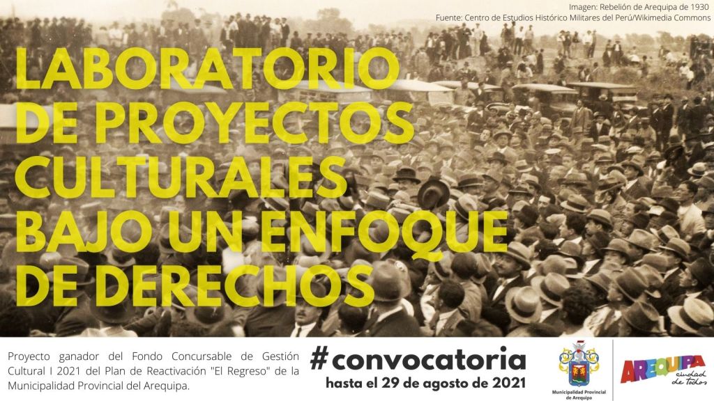 Del 03 al 18 de septiembre de 2021 se llevará a cabo el Primer Laboratorio de Proyectos Culturales bajo un Enfoque de Derechos, proyecto ganador del fondo concursable de Gestión Cultural impulsado por la Municipalidad Provincial de Arequipa, como parte del Plan de Reactivación del Sector Cultural «EL REGRESO II» de la sub Gerencia de Educación y Cultura.