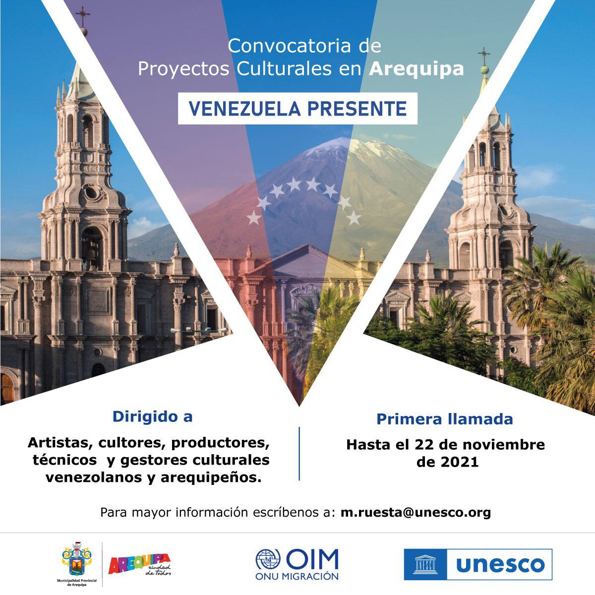 Los procesos migratorios son parte de la historia universal y han contribuido al desarrollo social, económico y cultural de distintas sociedades. La oficina de UNESCO en Perú, la Misión en Perú de la Organización Internacional para las Migraciones OIM y la Municipalidad Provincial de Arequipa presentan el programa: Venezuela Presente, una convocatoria de proyectos culturales que busca reconocer los importantes aportes de la comunidad venezolana en nuestro país y fortalecer los lazos de integración en una lógica de cooperación desde el sector cultural. Este llamado se realizará en Arequipa, una de las localidades con mayor presencia de ciudadanas y ciudadanos venezolanos en el Perú, la cual forma parte de forma parte de la Red de Ciudades Creativas de la UNESCO desde el año 2019 por su gastronomía y cuyo centro histórico fue reconocido como Sitio de Patrimonio Mundial de la UNESCO en el año 2000.